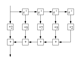 val kernel = [2, 5, 7, 5, 2] val prefix = ['a, 'b, 'c, 'd, 'e] val filter5 = (filter sig16 kernel prefix)