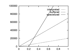 Let us now feel how compiler generation fits into the situation from the previous section. Initially the programmer type-checks and debugs a one-stage interpreter. Because specialization preserves the semantics of the code, producing an efficient two-stage procedure (a compiler that performs RTCG) is then just a matter of annotation and tweeking. Binding-time analysis performs the bookkeeping of program division and the specializer handles the mechanics of code construction. As an added bonus, since after annotation the source program can still run in one stage, it can be run in parallel with the compiler to soften the latency spike (Figure paris).
