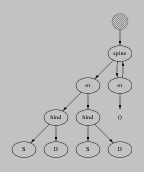 nodes (labeled `or') are successively reduced, resulting in a binding